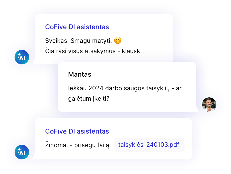 DI asistentas yra visada pasiekiamas įrankis, kuris padeda darbuotojams greitai rasti atsakymus į jiems rūpimus klausimus. Jis veikia 24/7 ir remiasi tik jūsų įmonės informacija, patalpinta platformoje, todėl pateikiami atsakymai yra tikslūs ir atitinkantys jūsų veiklos specifiką. Naudojamas DI gebėjimas apibendrinti turinį užtikrina, kad darbuotojai gautų aiškią ir koncentruotą informaciją be perteklinės paieškos.