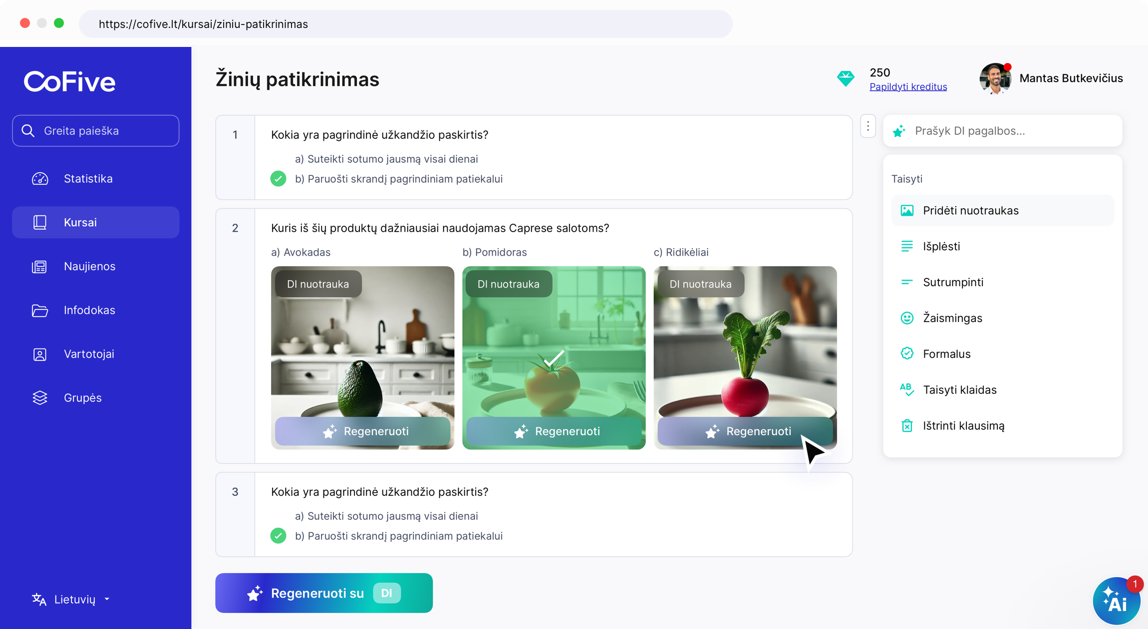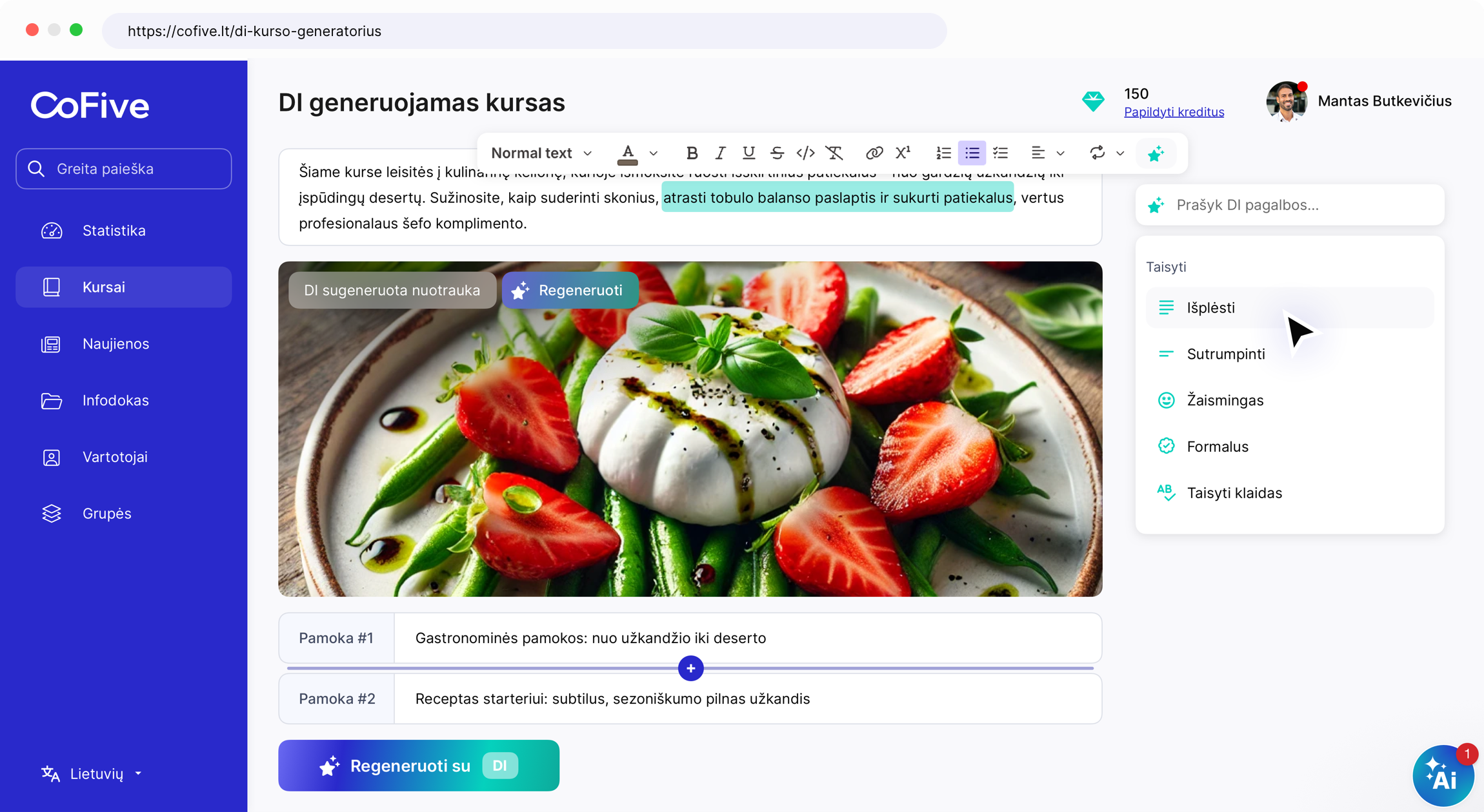Dirbtinis intelektas CoFive platformoje leidžia patogiai redaguoti tekstą. Galima jį išplėsti, sutrumpinti, pakeisti toną ar struktūrą. Net neturint paruoštos medžiagos, DI padeda lengvai sugeneruoti išsamų kursą. Platformoje taip pat veikia vaizdų generatorius, kuris pagal raktažodžius sukuria asociatyvius paveikslėlius. Norint įtraukti testą, pakanka pasirinkti klausimų skaičių ir sistema juos suformuoja automatiškai, naudodama tik jūsų mokymų turinį.