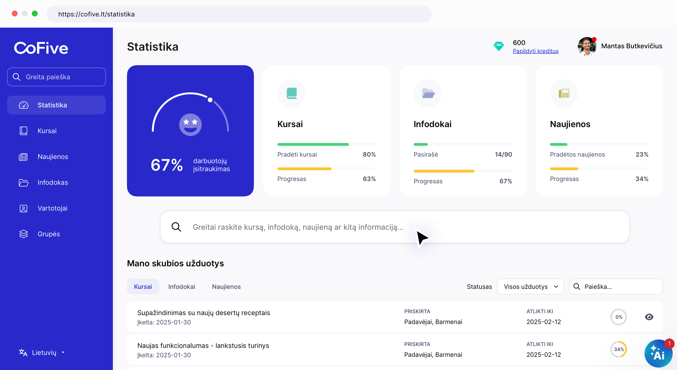 Naudojant platformą tapo daug paprasčiau organizuoti mokymus ir sekti komandos pažangą. CoFive ypač padėjo kuriant motyvacinę programą, vertinant darbuotojus ir greitai randant atsakymus per jų DI asistentą bei vidinę dokumentaciją – tai ženkliai taupo laiką ir pastangas. 😍