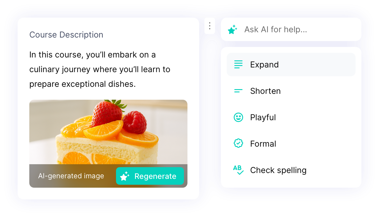 The AI on CoFive lets you easily build or improve your training content. You can expand text, shorten it, or change the tone and structure. Even if you’re starting from scratch, the system can generate a full course based on your topic. You can also generate images using keywords, and create knowledge tests automatically by simply choosing how many questions you need – the content comes directly from your course material.