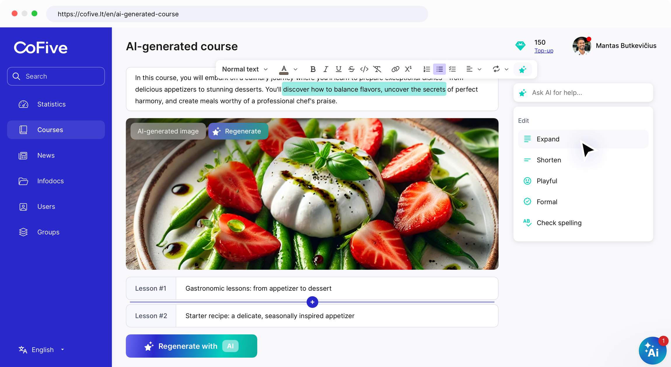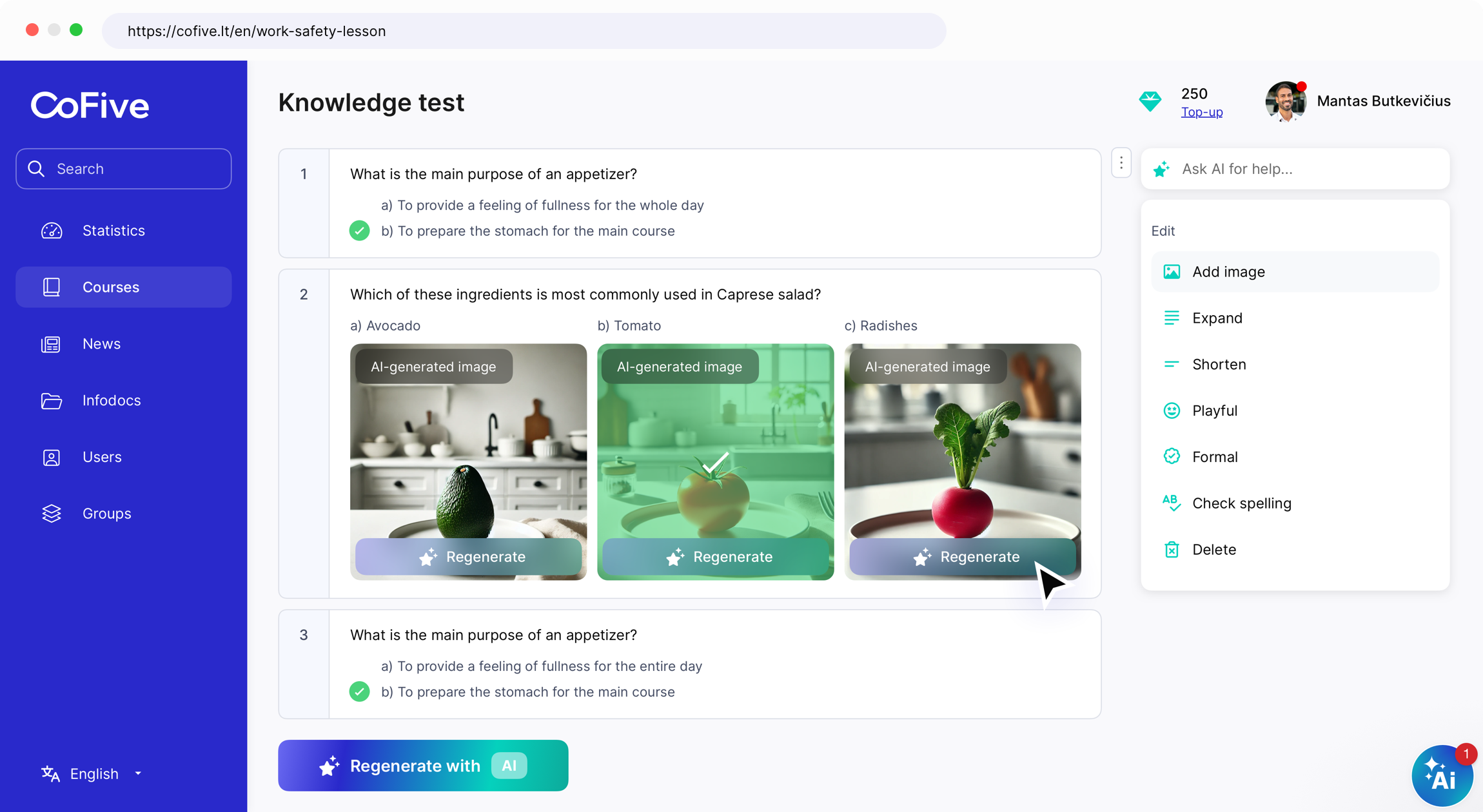 The AI on CoFive lets you easily build or improve your training content. You can expand text, shorten it, or change the tone and structure. Even if you’re starting from scratch, the system can generate a full course based on your topic. You can also generate images using keywords, and create knowledge tests automatically by simply choosing how many questions you need – the content comes directly from your course material.