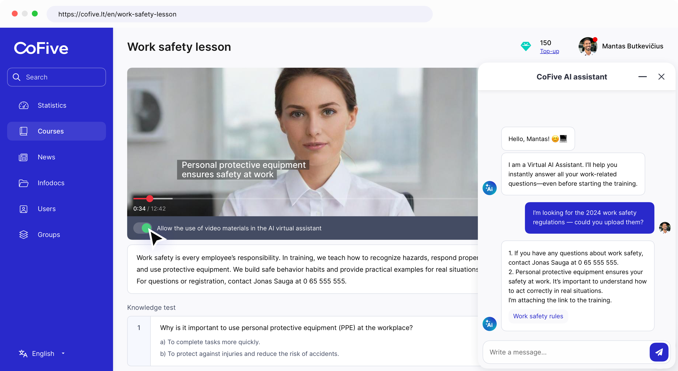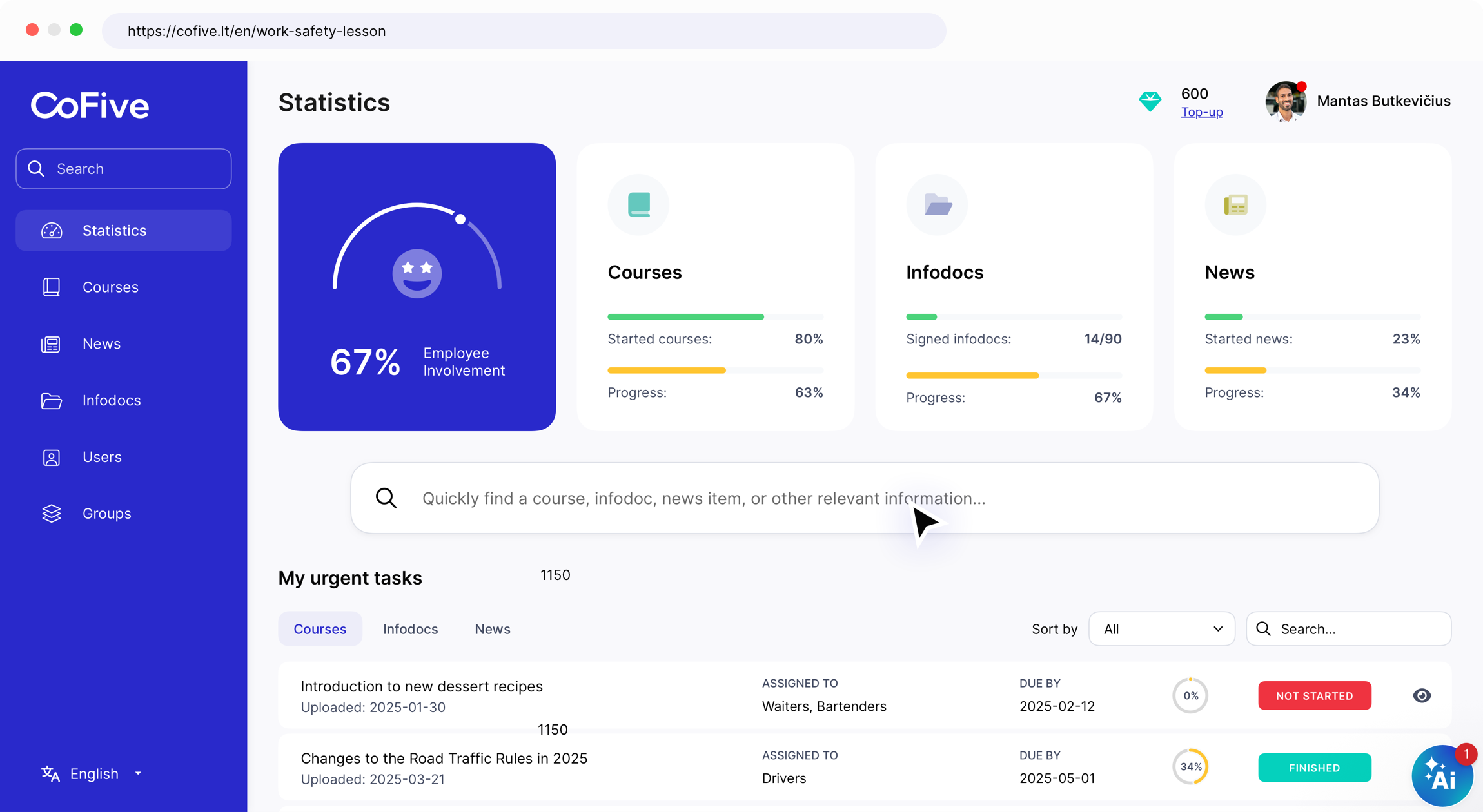 Using the platform has made it much easier to organize training and track team progress. CoFive has been especially helpful in creating a motivational program, evaluating employees, and quickly finding answers through their AI assistant and internal documentation – it significantly saves time and effort.